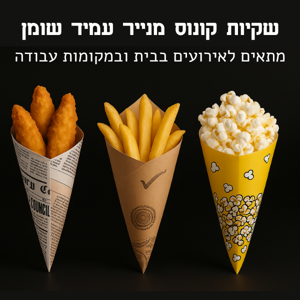 עניקו ללקוחותיכם חווית הגשה כיפית, אסתטית ונקייה עם שקיות הקונוס המעוצבות שלנו, המשלבות פונקציונליות וסטייל. מושלם לכל עסק בתחום המזון, אירועים ודוכני אוכל.